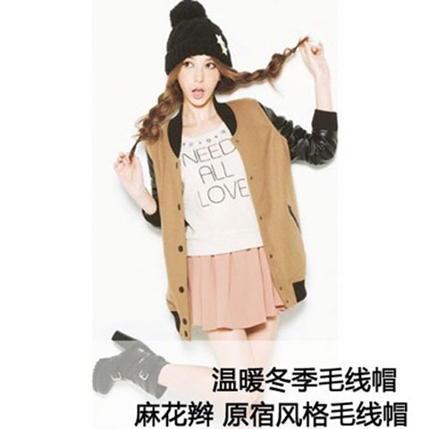 麻花辫+原宿风格毛线帽 在冬末春初的日子里,毛线帽子是温暖自己的必不可少的装备。同棒球帽的选择一样,今年流行纯色与小图案的搭配。翻边的毛线帽子,头顶毛茸茸的毛线球都是打造可爱气质的元素。 毛线帽子由于帽边会较紧,因此不适用于散发,会把头发整体压塌。而修饰它的最好方法就是将头发分成两股编成麻花辫,要注意蓬松感,这样即使摘下帽子也不会有塌塌的感觉。