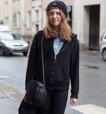 黑色的毛线帽半包裹上部头发,仅露出少许的短齐刘海,时尚又可爱,黑帽子和金黄色的烫发互相衬托,相得益彰!