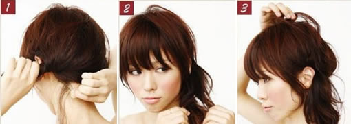 Step3:接着把头顶处的那束头发固定在刚用橡筋扎好的头发处。最后把头顶处的头发稍微向外拉一拉。这样就大功告成了。