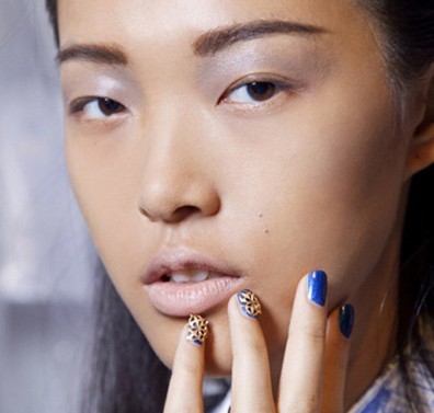 宝蓝色一直是贵族们的最爱。在宝蓝色的美甲上镶嵌上镂空的花雕金属饰品,非常的与众不同。这款流行美甲要搭配素雅的唇色,才能突出这款美甲的亮点,减弱美甲的浮夸,也能让整体更有品味。