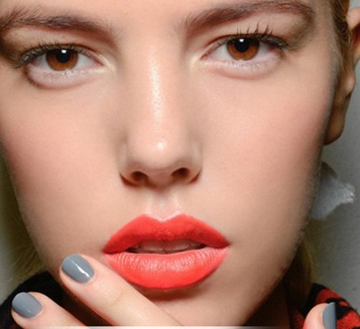 冷色系总能给人冷艳的感觉。干净的烟灰绿平滑充满光泽,让整个造型庄重优雅。冷色系与炙热红唇的碰撞,使视觉温度达到最佳的平衡点,流行而不俗套。