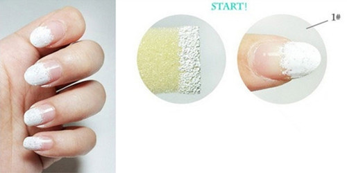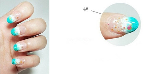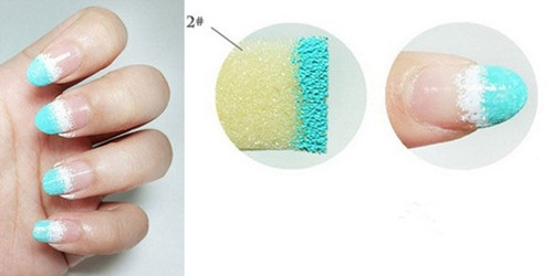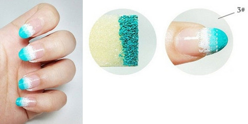 渐变美甲很受部分MM的喜欢,今天就给大家介绍一款渐变美甲DIY教程,教大家打造夏日海洋蓝,让清凉在指尖释放! 步骤一:在上甲油前记得要先上层底油,这样能保护指甲。用海绵蘸取白色加油,按在指甲1/2处。 步骤二:蘸取粉蓝色甲油盖在白色甲油的2/3,做渐变。 步骤三:再用最深的湖水蓝色叠加在粉蓝色上,如图。 步骤四:最后刷上带亮片的透明蓝色的甲油就完成了,很简单吧!