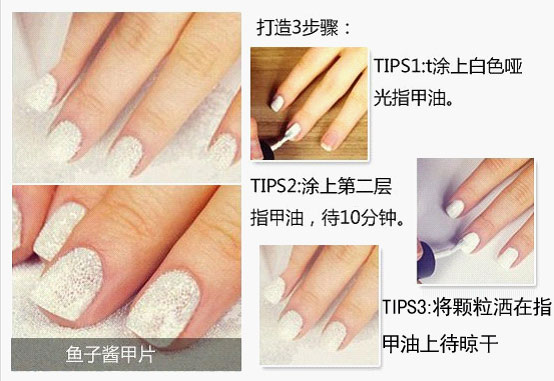 STEP3 :待指甲油开始变粘稠,就将微粒洒在一张纸或是一个盘子里,再倒在指甲上,这样能让指甲壳上呈现均匀的洒满亮晶晶的微粒。(本文由上海美甲学校整理编辑)