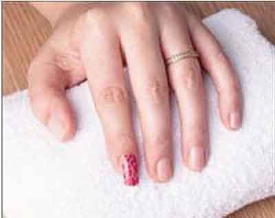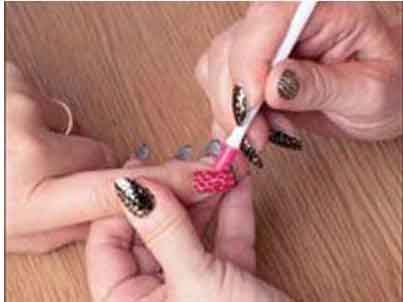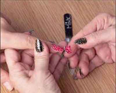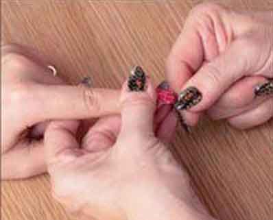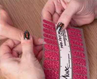 第四步:贴在指甲上,不要有气泡留下,用手指的温度和压力按压。