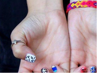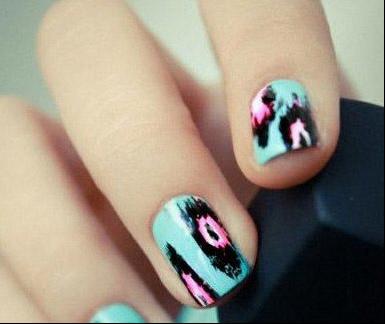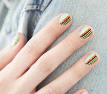 想要不同于其他人的民族风甲油,其实只要拥有一两瓶明度高的两种颜色指甲油,将两者混合出民族图案,或者交错涂抹,就能打造出撞色的异域风情。
