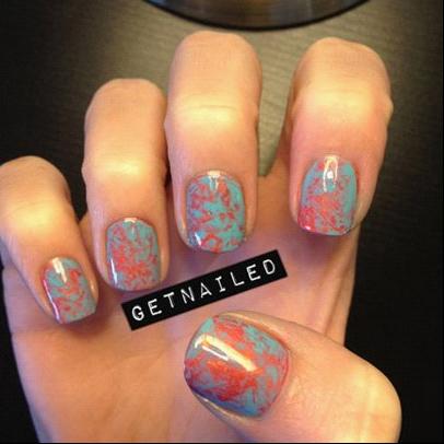 大理石纹理珊瑚色美甲教程二:珊瑚色的指甲油干透之后,在它的表面涂上一层蓝色的指甲油,涂好之后取出一小段的保鲜膜,把它揉成团状,轻轻地在蓝色的指甲油表面进行按压,在指甲上打造出自然的纹理。