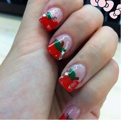2012美甲图案精选,用水果妆点指甲。爽脆的红苹果谁不喜爱,而且常吃苹果还有益健康。光吃不够还要看,所以就把苹果画到了指甲上了。先画上一层莹亮的粉色指甲油作为底色,待它干透后开始把苹果画上去了。蘸取红色的指甲油在指甲的中部开始画出红色的法式美甲款,同样是要等待颜色干透;接下来就可以用绿色的指甲油添上苹果的叶子了,无论是一片还是两片都可以,只要你喜欢就好。最后就是要画“梗”了,轻轻地在叶子根部添上小小的一笔,苹果就已经画好了。觉得苹果不够闪亮?小编也有办法,就是使用透明的水钻,伪装成水滴的样子吧。挑选适合大小的水转,把它粘贴到苹果的一侧就可以了。上述的美甲彩绘,亲爱的姐妹们已经学会了吗?