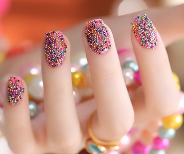 指甲就像鱼子酱一样,看起来就美味可口,而且立体的美甲看成2013最新美甲风格,在涂上一层淡粉色的甲油打底后,再把五彩的小珠子站上去,最好用甲油刷把彩珠刷在指甲上,这样一款时尚的鱼子酱美甲就完成了。