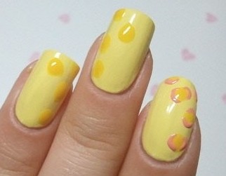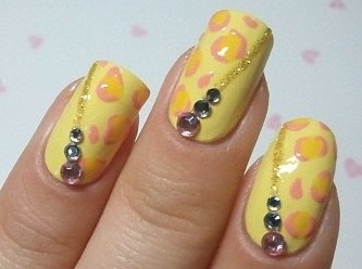 橘黄色的泡泡,斜排的钻,是一款适合宴会的美甲哦,也许平时用不到,但是保存好等姐妹们结婚时可就派上用场了,都来学学这款美甲教程吧! 步骤一:擦洗,打磨,上一层底胶,均匀刷上一层黄色的色胶; 步骤二:用画笔随意涂上几点深黄色的胶;在深黄点周围再话说两段粉红色的色胶,让它看起来像是气泡在阳光下的光泽; 步骤三:给指甲“戴上”礼仪带; 步骤四:照灯照干之后,封上封层,然后开始贴钻咯;沿着礼仪带往上贴上三颗钻,这款美甲就宣告完成了。更多美甲教程,敬请留意小编每日更新。
