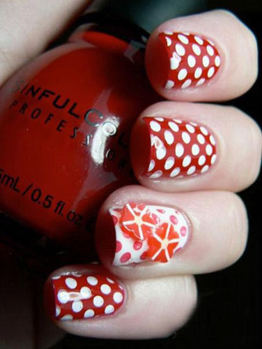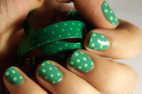 2 、等底色完全干了之后,自制波点指甲的关键步骤来了:用一张抠好小波点的纸张固定在指甲上,然后用选好波点颜色的指甲油刷在这张纸上,接着小心地揭去白纸,留下的图案就是波点指甲了。