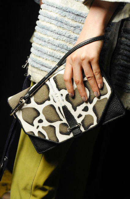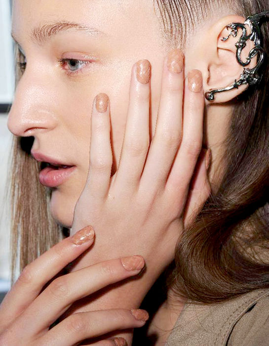 Philip Lim 优雅裸灰双色 也许裸色和灰色是设计师最青睐的两种颜色,于是美甲师将它们以“阴阳脸”的方式结合在一起。最常见的是两种饱和撞色打造的双色美甲,但是Philip Lim秀场的两种相近色似乎看起来也优雅十足。