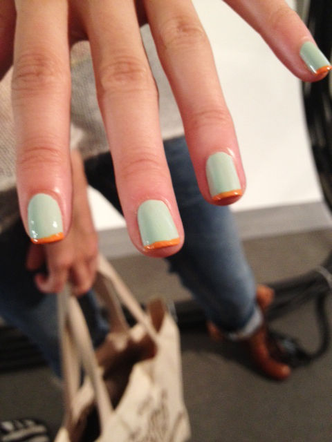Peter Som 冰淇淋法式美甲 这是一款薄荷绿加橙色的奶油质感法式美甲,是美甲品牌Zoya为了2013春夏Peter秀场而设计。经典的美甲款式和摩登的色彩融合在一起,Zoya也趁此推出了三合一的指甲油套装,售价$24美金,但是在秀场刚刚结束,就已经售罄。