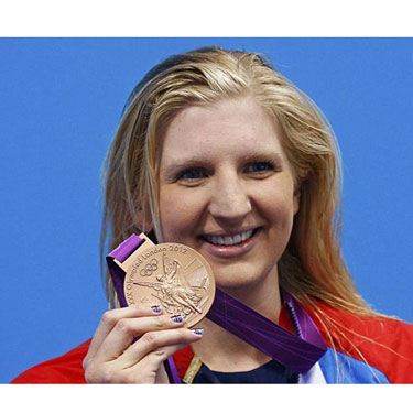 英国游泳运动员Rebecca Adlington面对镜头骄傲的展示自己的金牌,以及手指上的英国国旗图案的美甲。