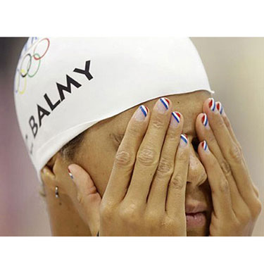 法国游泳运动员Coralie Balmy将法国国旗上运动的蓝色、白色和红色,用斜条纹的方式转移到了指尖。