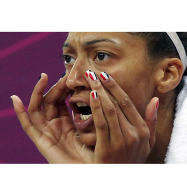 美国排球队的姑娘们上场前做了个美美的指甲,将奥运五环、美国国旗和英国国旗都运动到了美甲中。