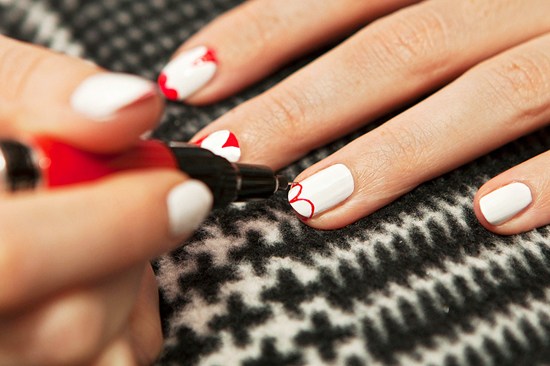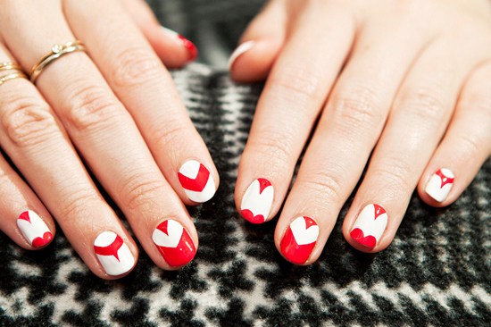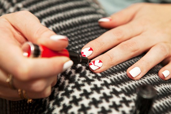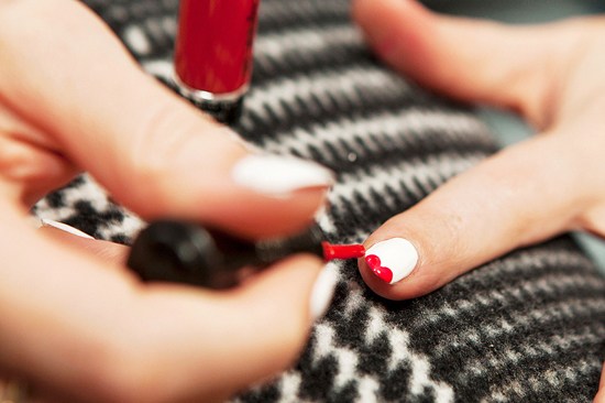 厌倦了一成不变的美甲,想要别出心裁,玩玩另类,苦于没有灵感怎么办?今天小编给大家介绍一款简单的美甲DIY教程,另类风格,简单易做,快让你的美甲个性起来吧! 第一步:白色指甲油打底 第二步:用指甲艺术笔勾勒图形,注意图形搭配上要错落开。 第三步:用红色指甲油上色。 就这么简单,告成啦,看看效果吧!
