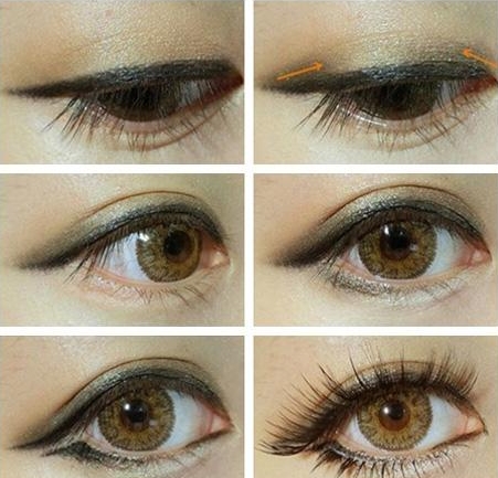Step1:首先用金白色的眼影涂抹整个眼窝,做一个大地,再用灰黑色画出眼线的形状,最好画粗一些比较好,再用银灰色画眼头和眼尾,这样可以打造出立体的感觉,用眼影刷把眼影稍微晕开一些,这样会比较自然,下眼线的话,用白色眼影画出眼头,再用金白色画眼中部分,接着用银灰色画眼尾,然后用眼线膏画出眼线,下眼尾和上眼尾的地方不要连起来,这样会显得眼睛很大,最后贴上假睫毛就OK了。