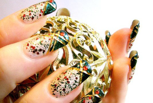 和上面两款圣诞美甲不同,这一款有点逆袭风。绿色闪粉、金色边、和红色点钻的搭配,时尚高贵,贵族气息浓厚。带上这款美甲,在圣诞出息高档的宴会,一定会让你成为全场的焦点哦!