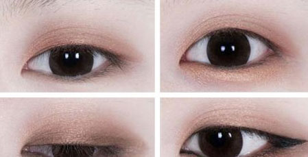 步骤1:先用金褐色的眼影涂抹眼窝处,做为打底色,涂抹整个眼眶,包括下眼睑处。 步骤2:在下眼睑处涂抹橙棕色的眼影,如图所示的效果。 步骤3:在画眼线之间,先用棕色的眼影涂抹眼窝,打造出处阴影的效果。 步骤4:用黑色的眼线笔,沿着睫毛要部画出一条细细的眼线,在眼尾处逐渐加粗,水平拉长。下眼睑处1/3处画内眼线,其余在眼外缘,淡淡的填充即可。