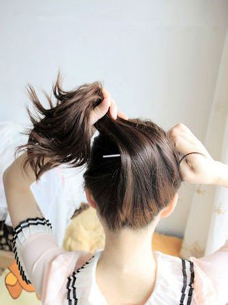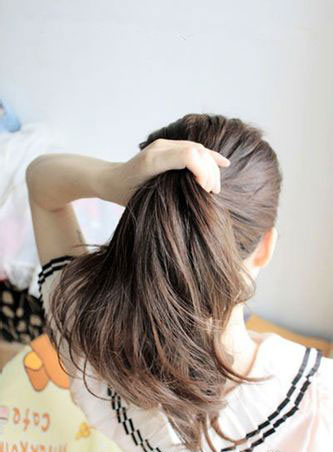2、把头发随意抓起一个高马尾,用左手抓住就行,不需要绑皮筋哦,马尾尽量不要太低,显得老气,我们要的是青春活力,哈哈。