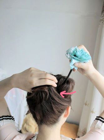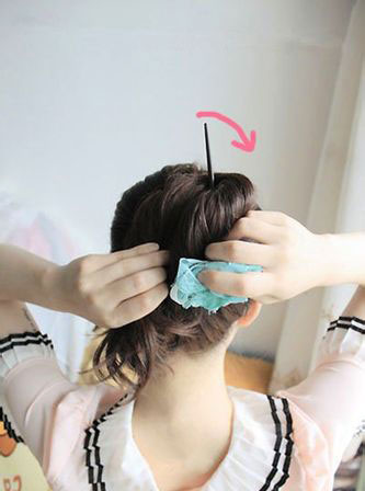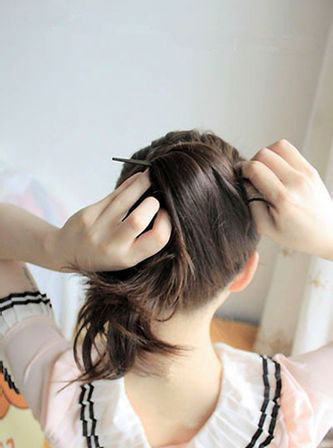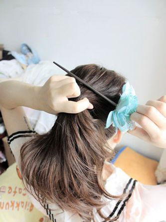 3、然后拿出今天的主要工具发簪放在马尾的上方。