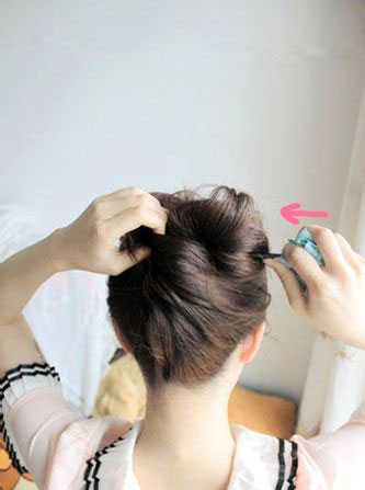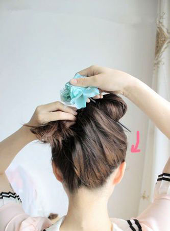 5、再绕着发簪往下, 如果头发较长的亲们要绕着发簪卷两次哦。