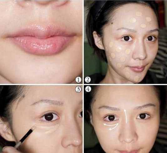 step1:上妆之前做好补水的工作,嘴唇要涂一层厚厚的润唇膏做准备。使用三滴粉底精华液(个人取量按个人嗜好),平均点在两颊两侧和额头,然后由内而外向外推匀,可以不用在上隔离霜。