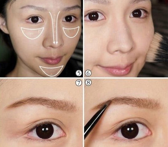 step3:首先将眼下苹果肌、鼻梁、下巴都大量,然后使用散粉来刷,可以减少底妆被破坏的几率。然后眉毛可以用浅色的眉粉刷刷出淡淡的形状,可从眉峰部分开始下笔,在慢慢向前晕染。