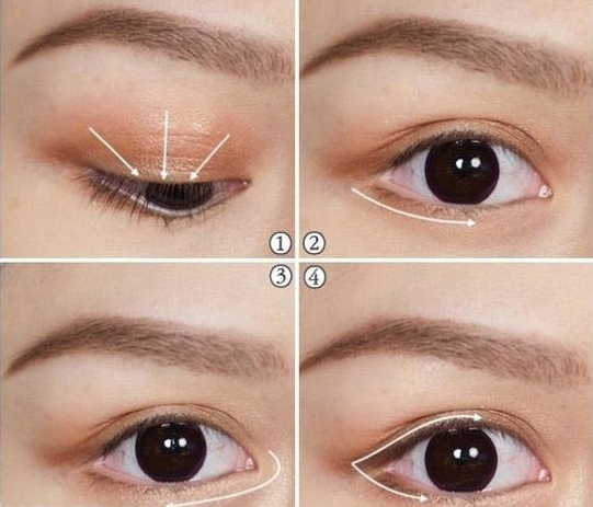 step5:画眼影,先用咖啡色在上眼皮打底,然后晕开。下眼线用同色画,刷至眼中即可(如图),然后用珍珠白打亮眼角C部位。眼尾C部位则用深咖啡色来加强,营造开眼尾的效果。