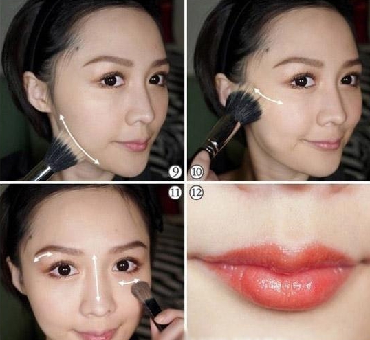 step7:然后在腮帮子部位刷上修容粉,眉骨、鼻梁、眼下苹果肌、下巴,用打亮的打亮,最后补上唇彩这款妆容就OK了!