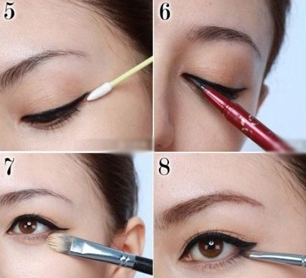 step3:用棉签清洁眼尾的不干净眼尾,然后用眼线液,从眼头部位稍稍超出一点点,画出一个立体三角感觉。