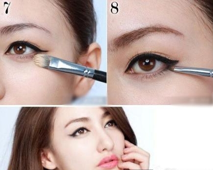 step2:眼尾部分,需要向上勾勒出一个弧度,眼尾收尾部分一定要立体尖,然后用刷子清洁多出来的眼线。