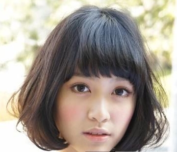 这款黑色的齐刘海短发梨花头,在齐刘海的部分给人一种非常甜美又很清丽脱俗的感觉,特别是加上黑色发色后,发尾随意自然的内扣卷翘感大大增加了整个发型的美感,让圆脸也变得甜美又可人。