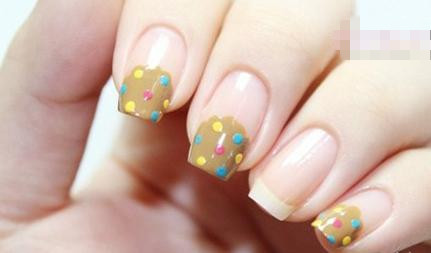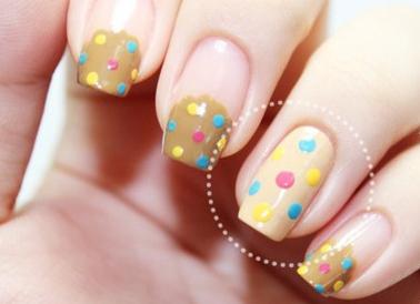 自己做美甲第五步:无名指涂抹一层米黄色指甲油,为无名指也添加彩色波点。 好啦,看看效果吧,自己做美甲就完成了,看看你做的怎么样?如果不尽人意,那就多多练习啦!