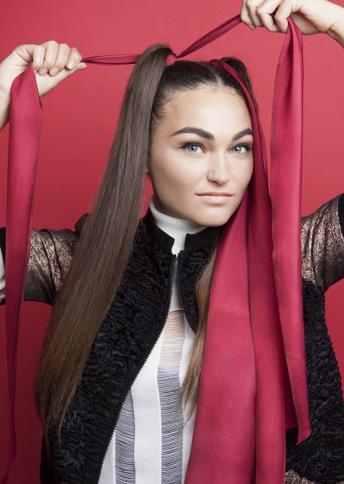 取两条长长的发带,注意发带至少要比自身头发长一倍,这样才够编发使用,分别系在左右两边的马尾底端。