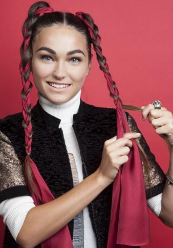 把头发和缎带编在一起,在最底端部分,留一节用小的皮绳绑紧,可以把多余的缎带剪掉。