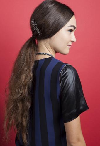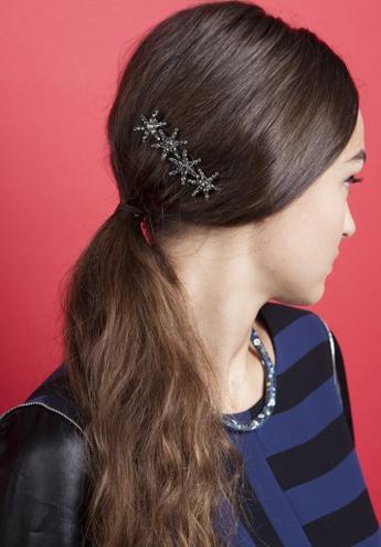 最后加一个满天星的发夹在一边耳后,靠近马尾的地方,这样一款星星发夹打造的马尾就完成了,你也可以用秋冬流行的金属色系或是宝石发夹作为代替,效果同样出众。