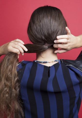 用手指随意梳开卷发,梳一个较低的马尾辫。把马尾均分成2份,用梳子把马尾的部分依次打毛,使头发看起来很蓬松。