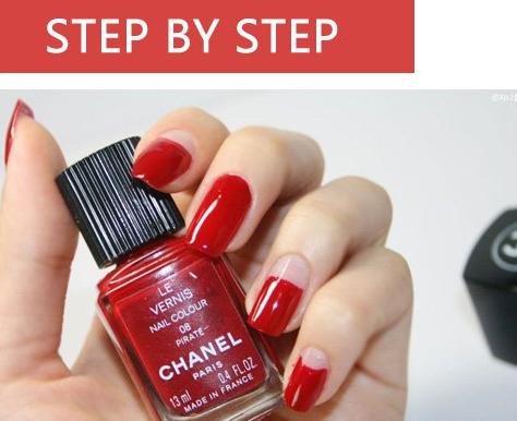首先用红色的指甲油涂抹,要注意选用正红色的指甲油,看起来才能更帅气更鲜亮哦!按照图片上的画上指甲油,拇指,食指,无名指和尾指都不是全部涂抹的,记得留下一小节空白。
