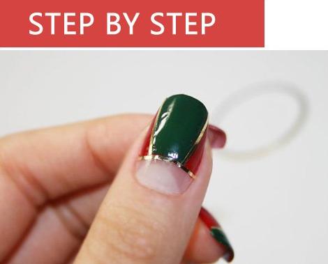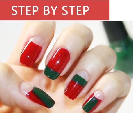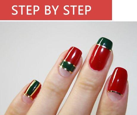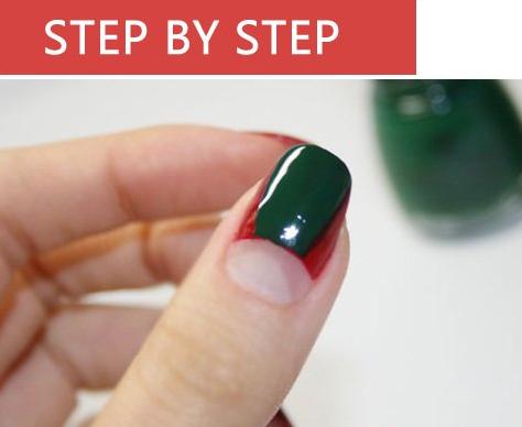按照图片的样子把深绿色的指甲油涂抹上,红绿色的搭配圣诞节feel的经典搭配。