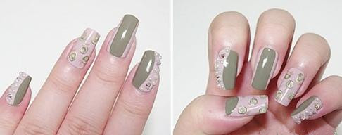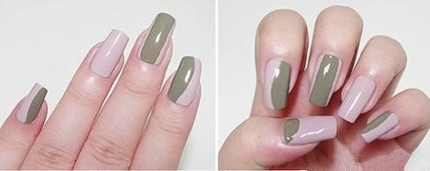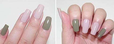 在为指甲涂抹底油保护之后,用卡其绿色指甲油涂抹食指和小指,其余指甲则涂抹灰紫色指甲油,等待指甲油干透。