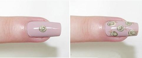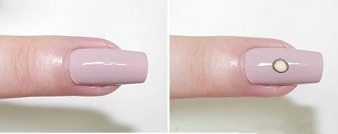 下面要进行美甲彩绘的部分了。蘸取卡其绿色指甲油,在灰紫色甲面上点出一点,不必画得太圆,随意就好;趁指甲油还没干透再用米黄色指甲油点出一个稍小的圆点叠加其上。