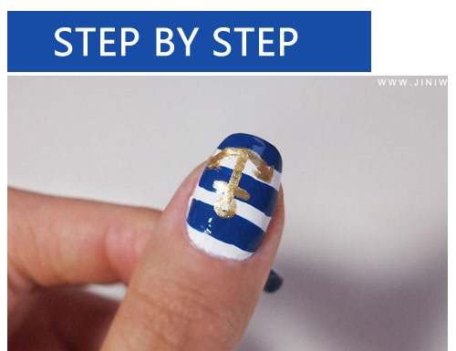 ★ STEP 7 蘸取金色的指甲油,在大拇指上画船锚的图案。 ★ STEP 8 画好之后就是图中的样子,不熟练的mm也可以先在画纸上联系一下。