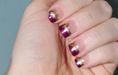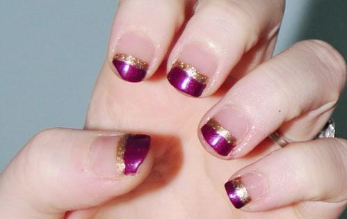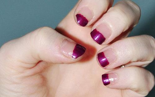 简单diy美甲步骤一:首先为指甲做好基础的清洁保养工作。去死皮,抛光,打磨和涂上保护角质层的营养油。在指甲顶端涂一层紫红色指甲油。