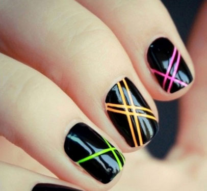 ★ STYLE 2 黑色指甲油作为底色,画上不规则分布的不同颜色的线条,简单点缀就很不一样,时尚又不会失大体。