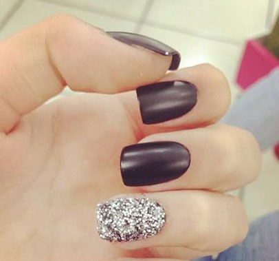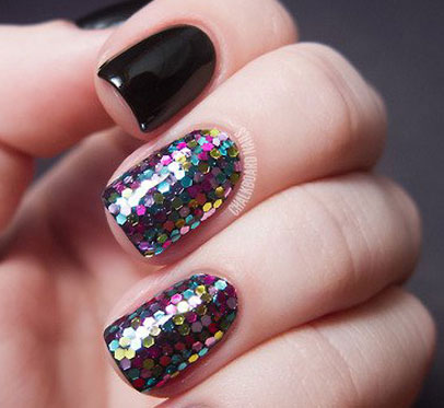 ★ STYLE 3 同样是黑色美甲,但是个别指甲选择不同的指甲油就会很不一样,比如像这个一样中指和无名指选用彩色亮片的指甲油涂抹。整个美甲显得与众不同许多。
