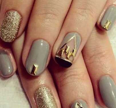 ★ STYLE 6 灰色底色的指甲油不会像黑色那么强硬,点缀上特别的各种图案和亮片,无名指用金色闪闪指甲油,几何三角形的图案增加时尚度,是一款很大牌感的美甲。