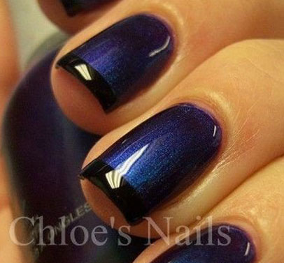 ★ STYLE 9 高贵大气的深蓝色指甲油,带有隐约的亮粉,前端画上黑色的法式美甲,整个气质提升了许多。
