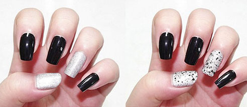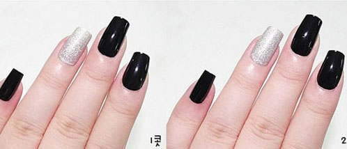 待底油干透后,马上涂上第二层有色的指甲油,食指、中指、尾指涂上闪亮平滑的黑色,拇指和无名指涂上银色甲油,当然,如果你喜欢,可以自由搭配颜色哦。注意,涂满一个指甲不能多于三笔。