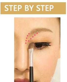 喜欢眉形干净的mm,可以用沿眉毛轮廓涂刷些许粉底。眉头和鼻梁的过度不能忽略哦,蘸取少量阴影粉刷在图示位置,能令眉毛和鼻梁都显得更为立体,一箭双雕。】